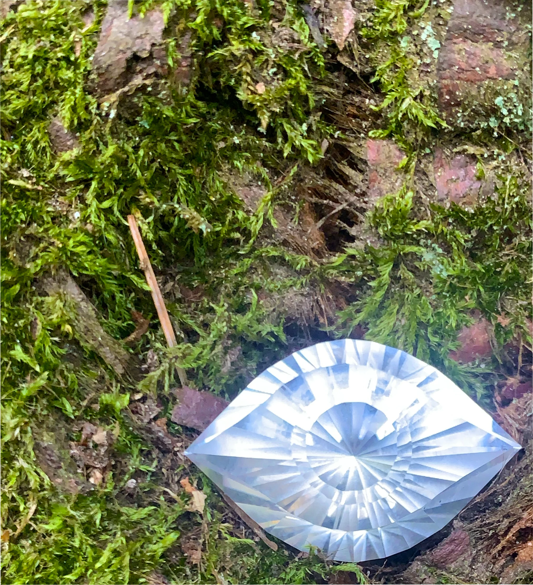 Dennis has a deep fascination with the “Eye” gemstone cut—a design originally created by the late Bob Kellor, who named it “Cleopatra’s Eye.” Dennis’s version is a refined adaptation of Kellor’s original, which has been tailored and changed for hand-faceting methods that rely more on visual intuition and tactile feedback than on machine-calibrated angles and gauges.