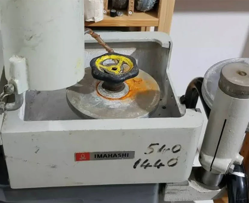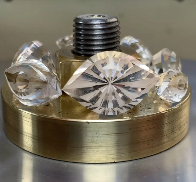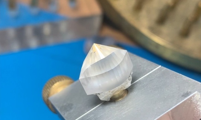 The process begins with selecting a suitable piece of faceting rough. The chosen rough is secured onto a brass dop using wax or CA adhesive. This dop is then inserted into a handpiece, which ensures precise control of the stone’s angle and position during the cutting and polishing phases. The lap is the flat, spinning disc placed on the faceting machine — is used in both the cutting and polishing stages.